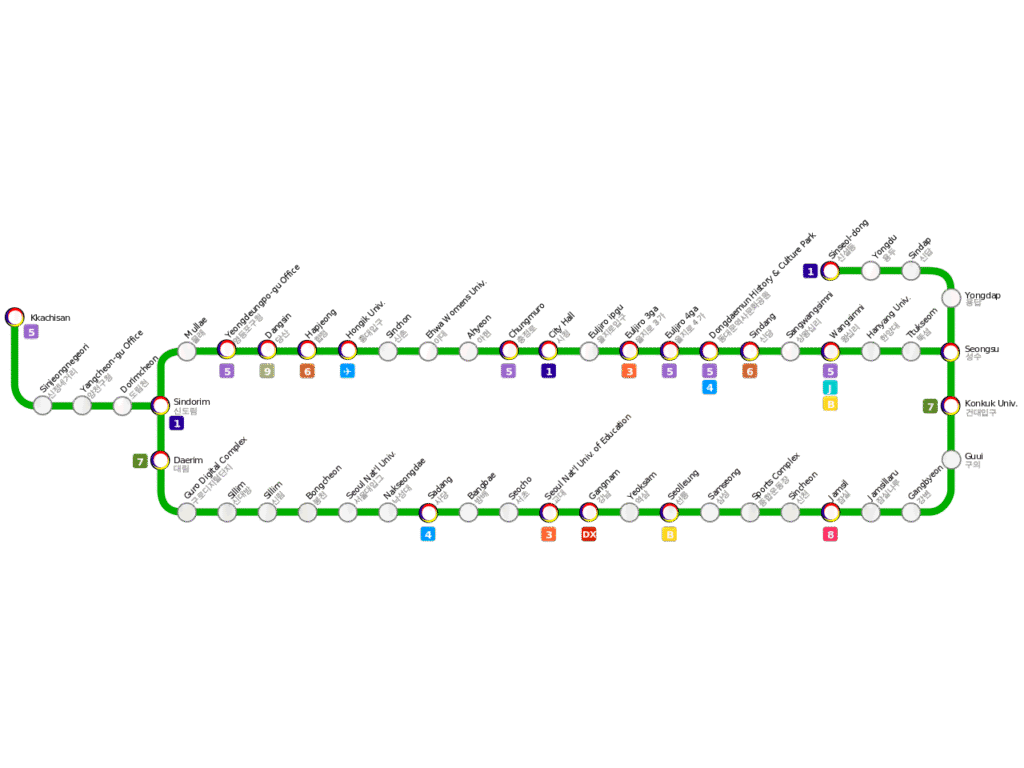 You can visit almost all famous tourist destinations, including Myeongdong, Hongdae, Seongsu, Gangnam, COEX, and Lotte World, without transferring if you use Line 2.